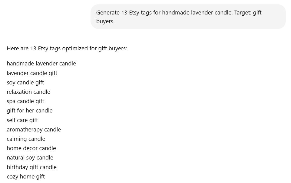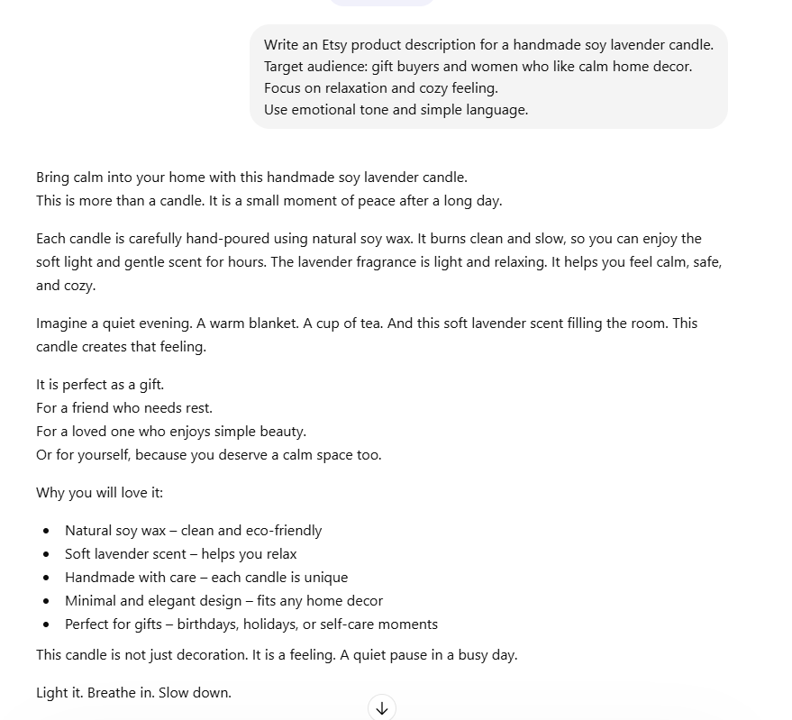“Write a warm, emotional Etsy description for a handmade lavender candle. Target gift buyers. Include benefits, mood, and simple CTA. Use natural tone.”