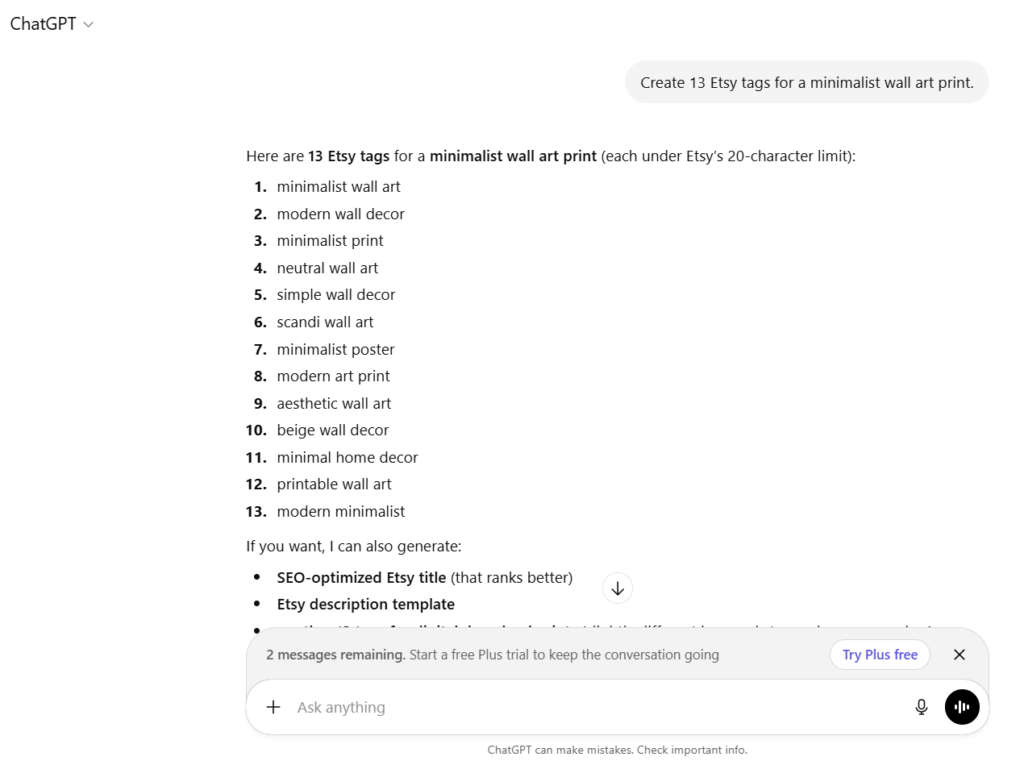 - “Create 13 Etsy tags for a minimalist wall art print.”