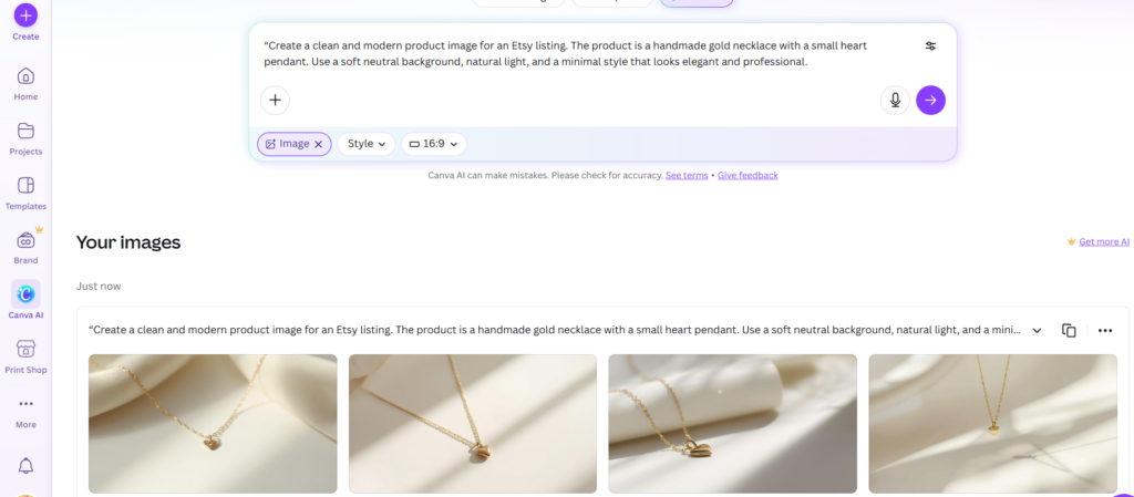 Great visuals are very important on Etsy. Canva’s AI tools help you create product images, social media graphics, and mockups quickly.