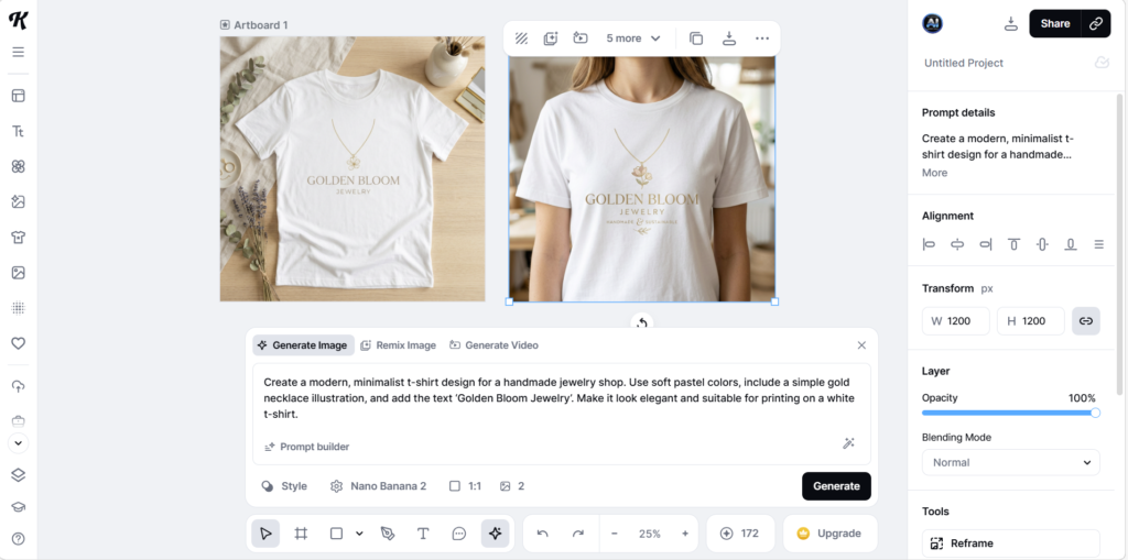 If you sell digital products or print-on-demand items, Kittl is a game-changer. It’s more than just a design tool – it combines AI generation, templates, and advanced editing in one platform. Whether you are creating t-shirts, mugs, wall art, or digital downloads, Kittl makes the process fast, creative, and professional.