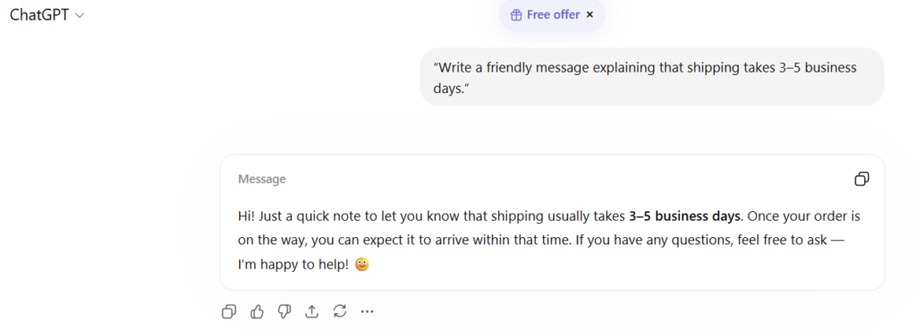 A customer asks about shipping. Instead of writing every reply from the beginning, you can ask AI: