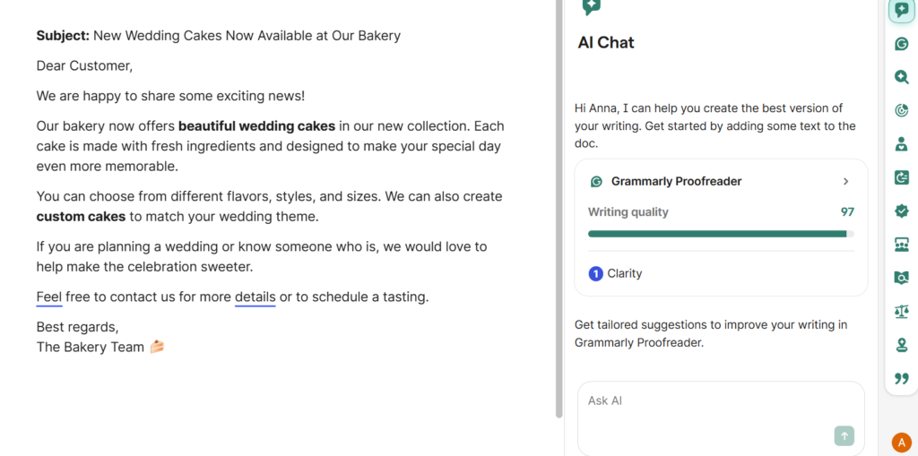 Before sending it, Grammarly checks the message and suggests improvements.