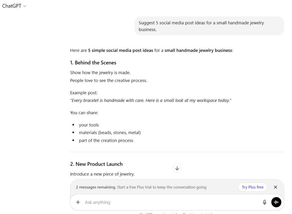 “Suggest 5 social media post ideas for a small handmade jewelry business.”
