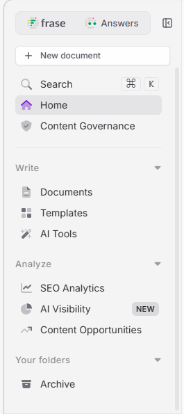 The left sidebar of Frase has AI Tools for content helpers (like writing titles or captions) and other features (not needed for basics). But to start, focus on the main workflows above.