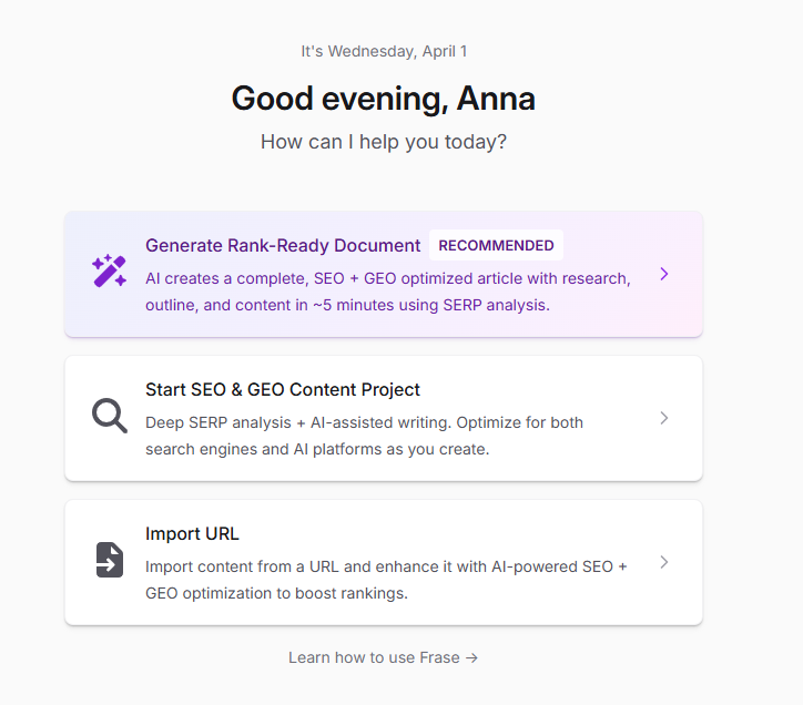 First, go to frase.io and sign up for a free trial. Click “Start My Free Trial” on the site’s home page. Frase will ask for your email to create an account. Once registered, you’ll receive some free document credits. For example, every new trial includes 1 Rank-Ready credit and 2 Research Project credits to explore the features. These credits let you try out Frase’s main workflows. You’ll also see your dashboard, which is the Frase home page for starting projects.