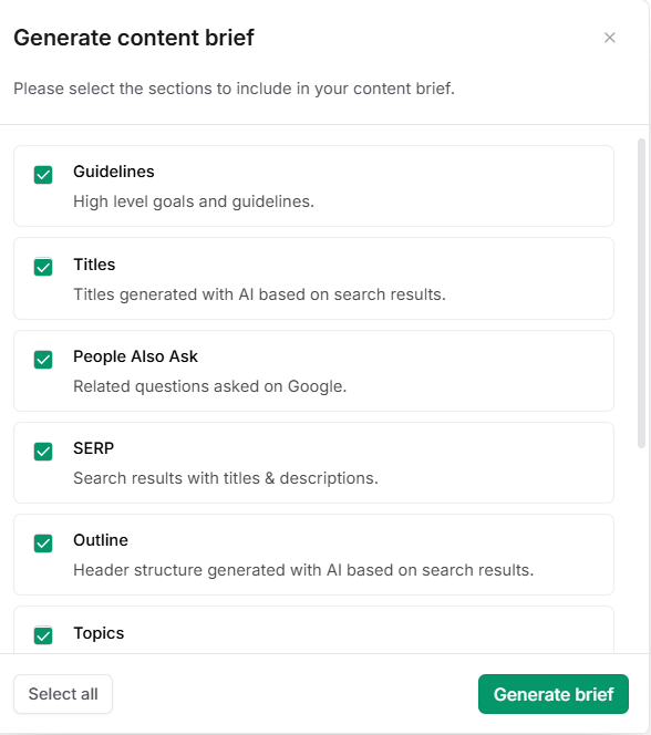- Frase will show options for what to include (like suggested titles, headings, questions, stats, etc.). Keep the default selections or adjust them.