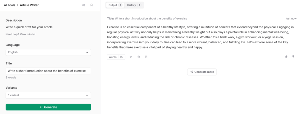 Frase will use AI to generate or modify text based on your instruction. The commands can include tone or style. For example, you can ask “Write a paragraph explaining cats for a beginner audience.”