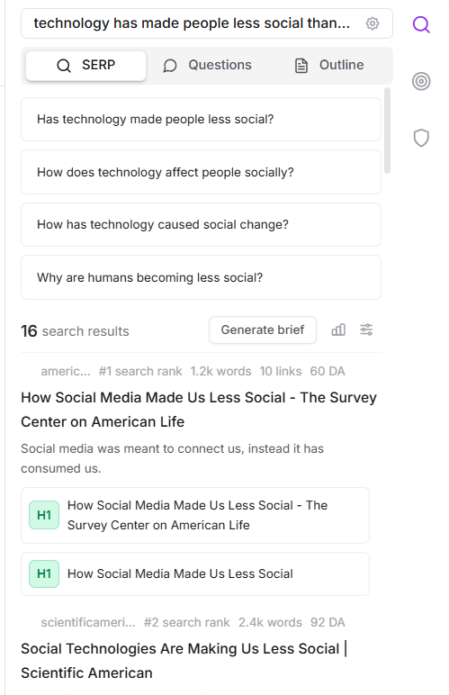 - SERP Tab: Shows the top Google results and their titles/headings. You can view competitor outlines and even click to copy any heading into your outline. This tells you what structure works for the topic.