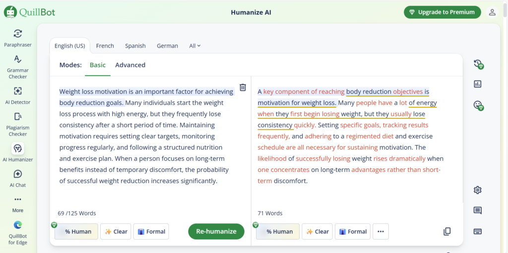 - QuillBot AI Humanizer (Tool 2) – Good results, free Advanced version after login, some underlined suggestions, AI detector included.