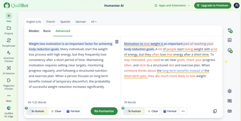After humanizing the text, some parts are underlined. You can click on them and choose alternative suggested words. The Advanced option requires logging in, but it is still free to use.