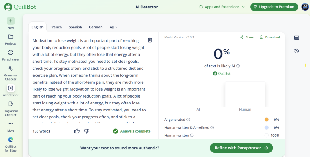 Aww, unfortunately my AI detection tool flagged the humanized text as 100% AI. Interestingly, QuillBot also has its own AI detector, and it shows a completely different result. This makes the tool test a bit confusing.