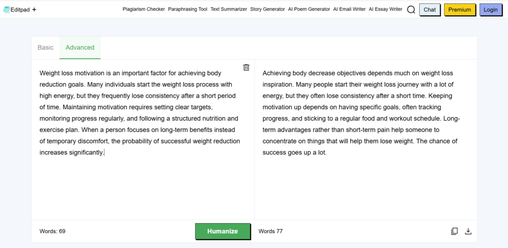 - Editpad AI Humanizer (Tool 4) – Best results, free Advanced version, extra features like Story and Poem Generator, plagiarism check, summarizer. Fast and easy.