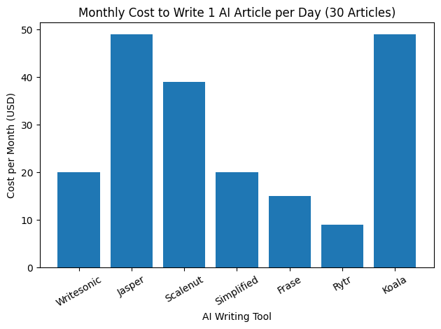 Below, you’ll find a cost comparison and bar chart showing the monthly price of popular AI writing tools — including Writesonic, Jasper, Scalenut, Frase, Rytr, Simplified, and Koala — when used for daily article production. This breakdown helps identify which tools offer the best value for money when content volume and quality are equally important.
