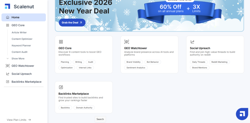 Scalenut is a full‑stack content growth platform that helps you plan, write, optimize, and monitor content so it ranks on search engines and gets discovered by AI platforms like ChatGPT, Perplexity, Claude, and others.